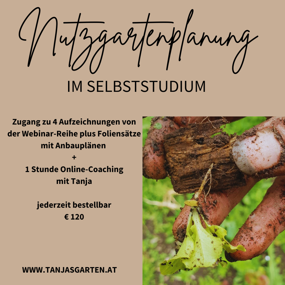 Für Menschen, die bei den Terminen nicht dabei sein können oder lieber im eigenen Tempo arbeiten, das Selbststudium "Nutzgartenplanung von der Ernte her" ist optimal. Sie bekommen Zugang zu einer eigenen Seite, wo Aufzeichnungen verlinkt sind und Downloads bereit stehen.