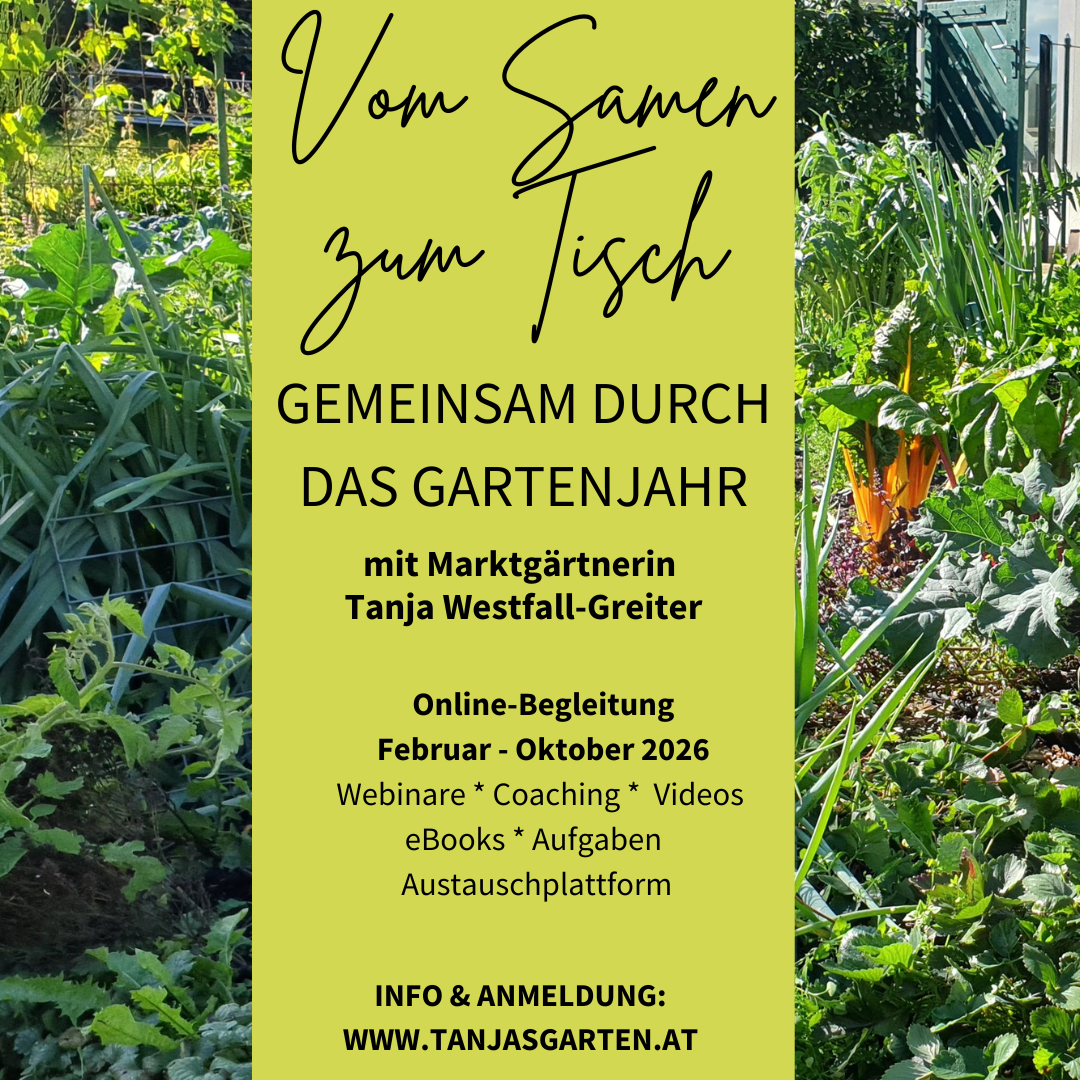 Vom Samen zum Teller begleite ich euch von Februar bis Oktober durch das Gemüsegartenjahr. Das Programm beginnt mit der obigen Webinar-Reihe zum Thema Nutzgartenplanung, die die Grundlagen für ganzjährigen Genuss schafft. Sie können live dabei sein oder im Selbststudium die Aufzeichnungen anschauen. Termine für unsere zweiwöchentlichen Online-Treffen / Webinare werden in der Gruppe vereinbart. Themen:
