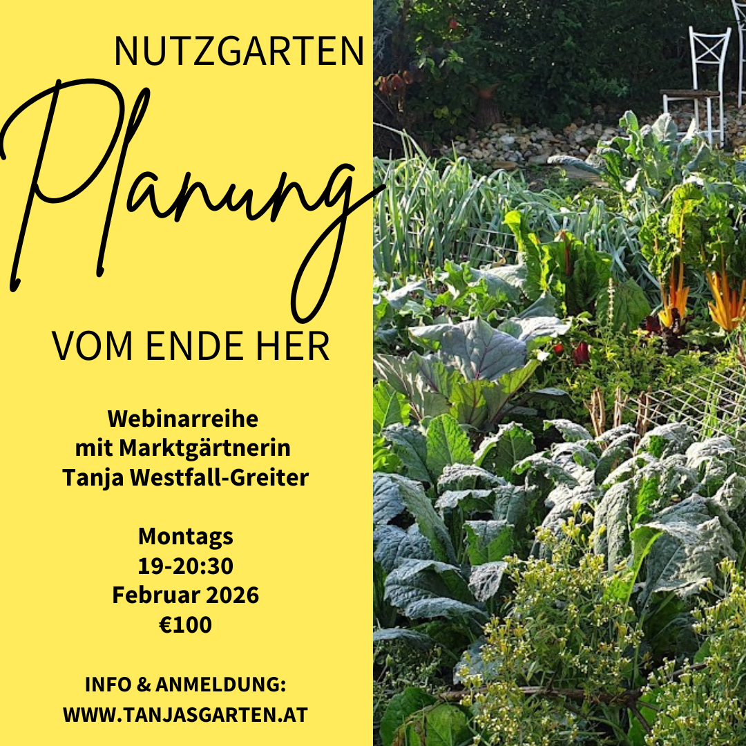 Alle Jahre wieder: Die Webinar-Reihe "Nutzgartenplanung vom Ende her" schafft die Grundlagen für den Anbau von Gemüse und Kräutern, damit man möglichst viel Frisches und Gesundes aus eigenem Garten ernten kann, und das ganzjährig. Ob klein oder groß, am Anfang oder erfahren, ich teile mit euch mein Wissen über Vielfalt durch alle Jahreszeiten. Wir fangen an mit einem Überblick über unterschiedliche Planungsstrategien und Gemüse durch die vier Jahreszeiten, dann gehen wir in die Tiefe und fokussieren auf Frühling, Sommer und Herbst und Winter.